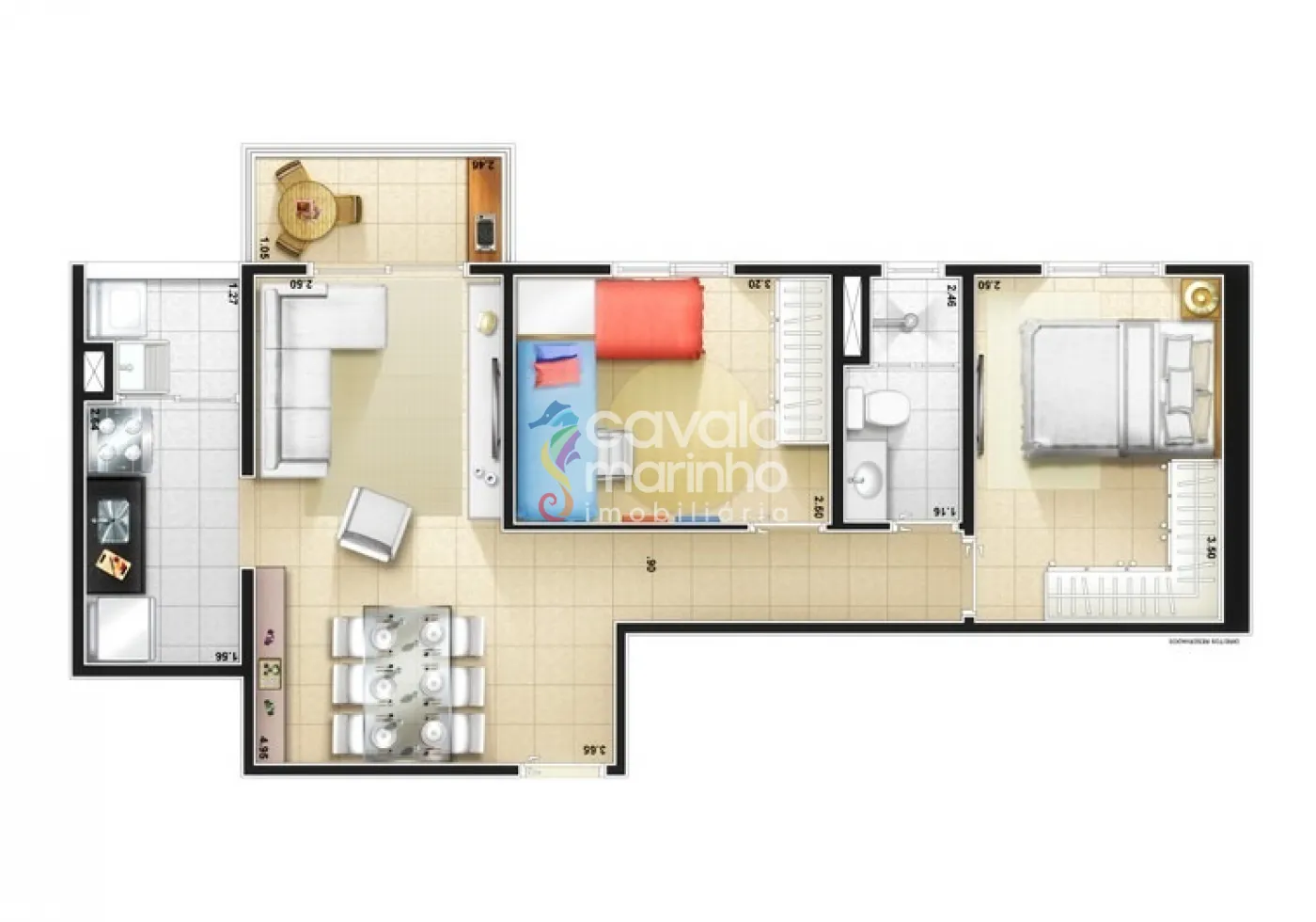 O apartamento conta com 2 quartos, banheiro, sala dois ambientes, sacada, cozinha, área de serviço e 1 vaga coberta de garagem.