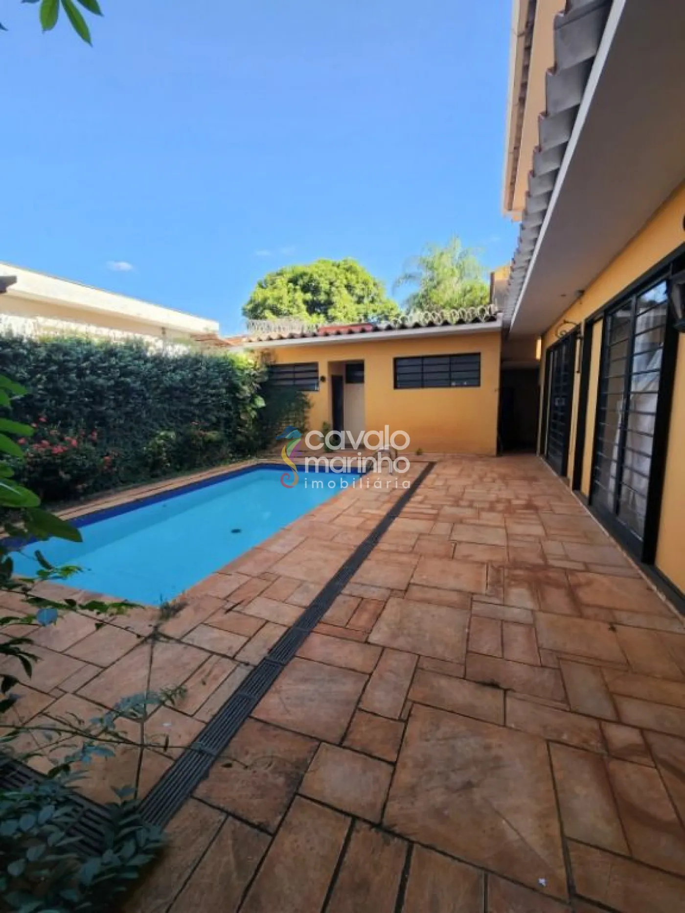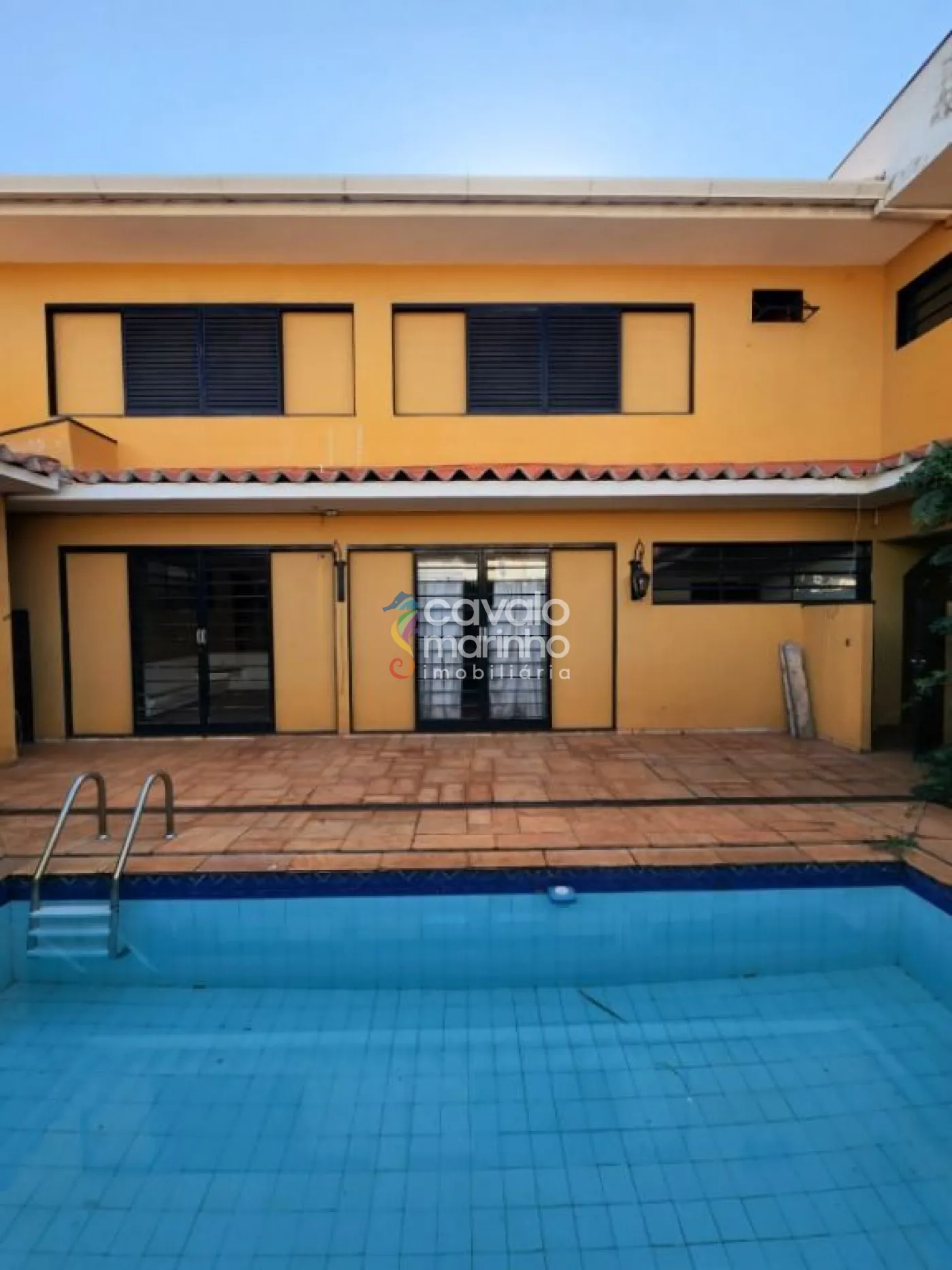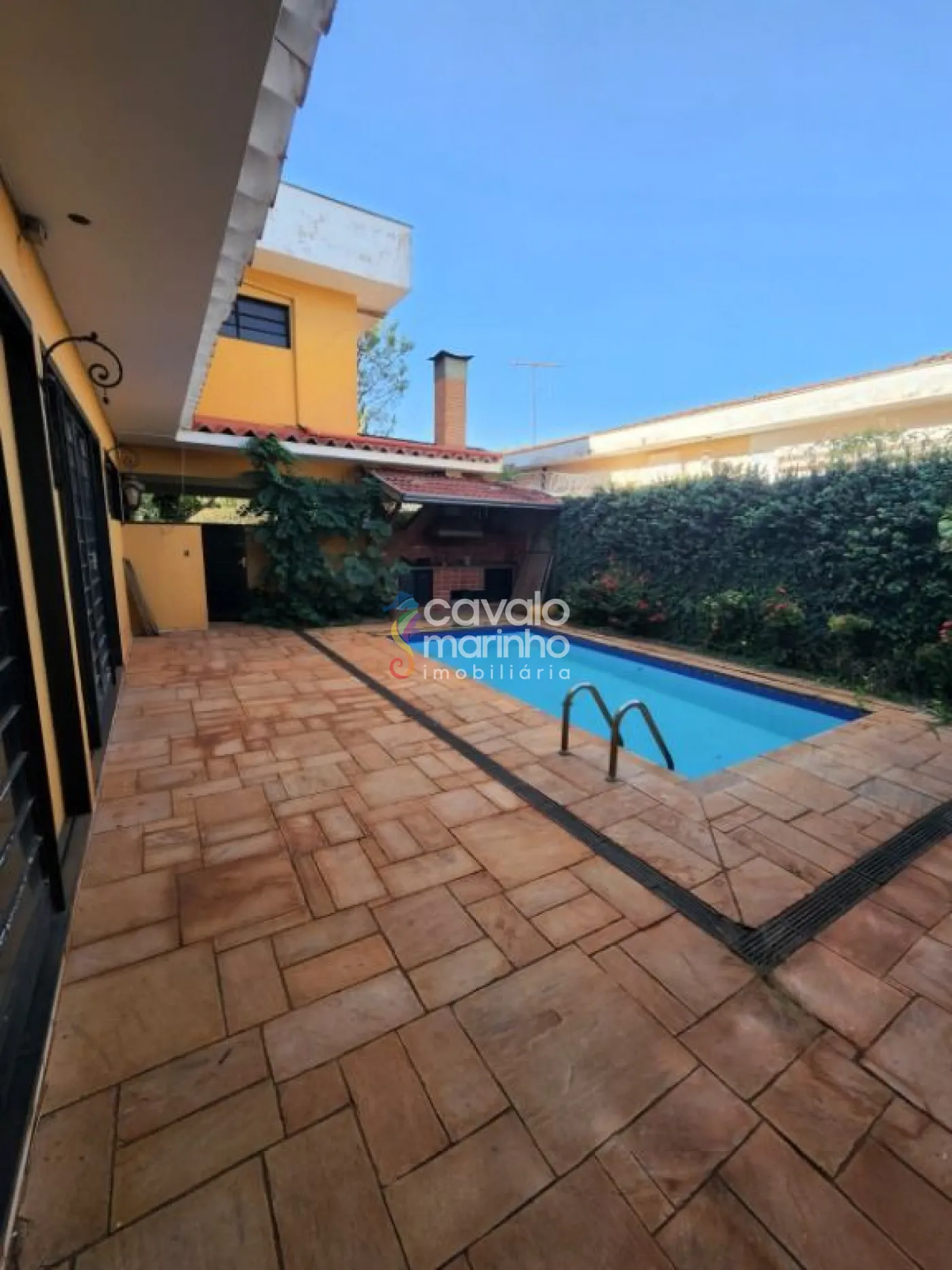 A área externa inclui um amplo quintal, espaço para piscina, área de serviço e garagem para quatro veículos.