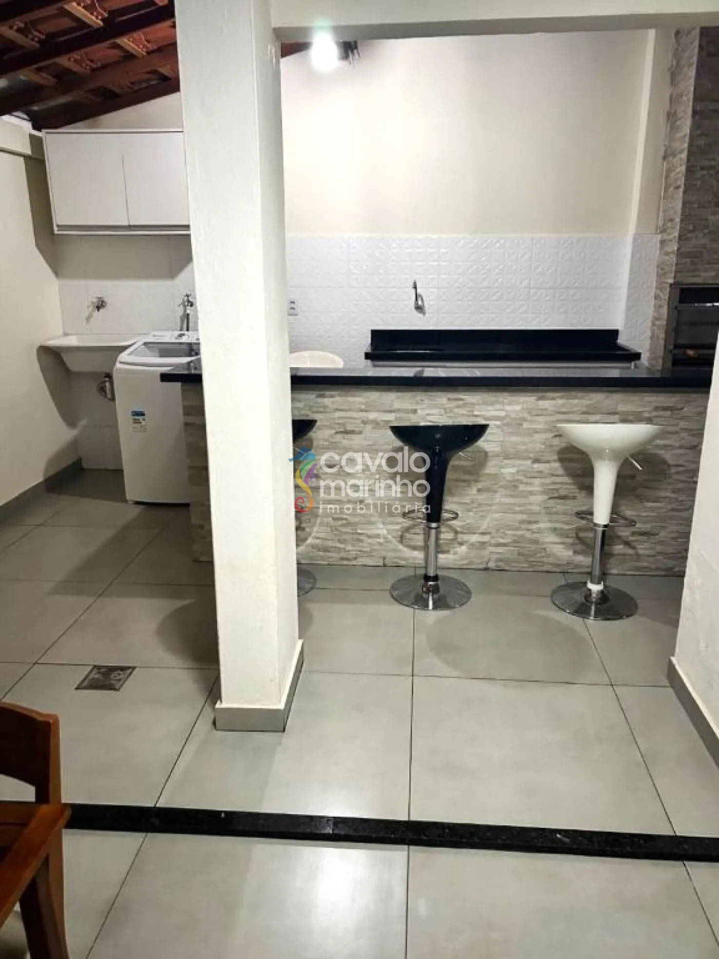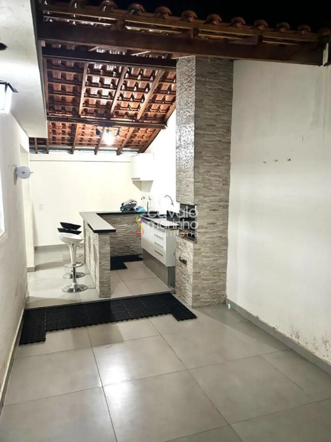 A residência conta com dois quartos, sendo que um deles possui armário, além de banheiros, uma sala aconchegante, e uma cozinha com armário. Para momentos de lazer, a área gourmet com churrasqueira é o destaque, enquanto a área de serviço e as duas vagas cobertas na garagem completam a praticidade deste lar.