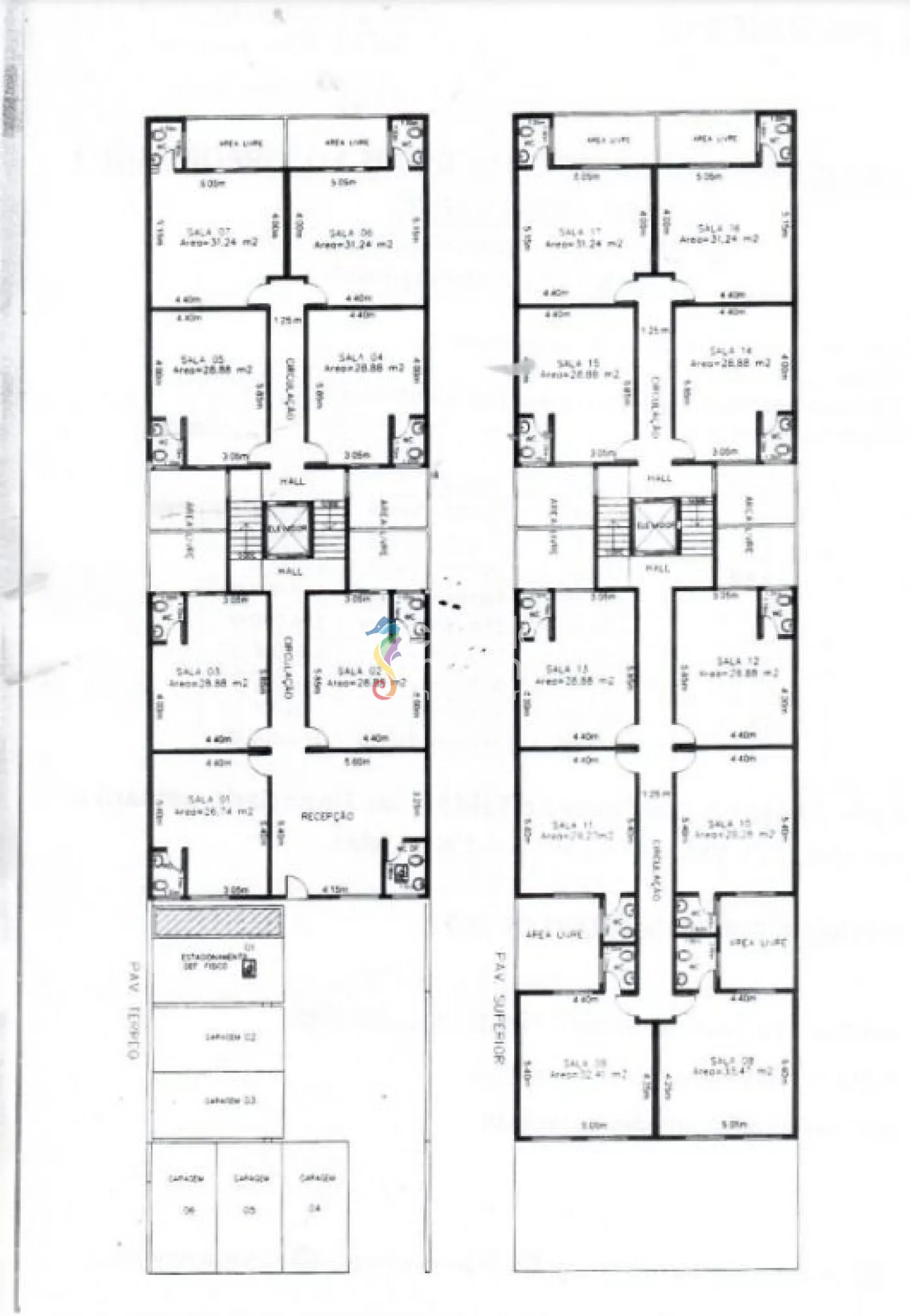 Salas a partir de 26m², opções de térreo e 1º andar.