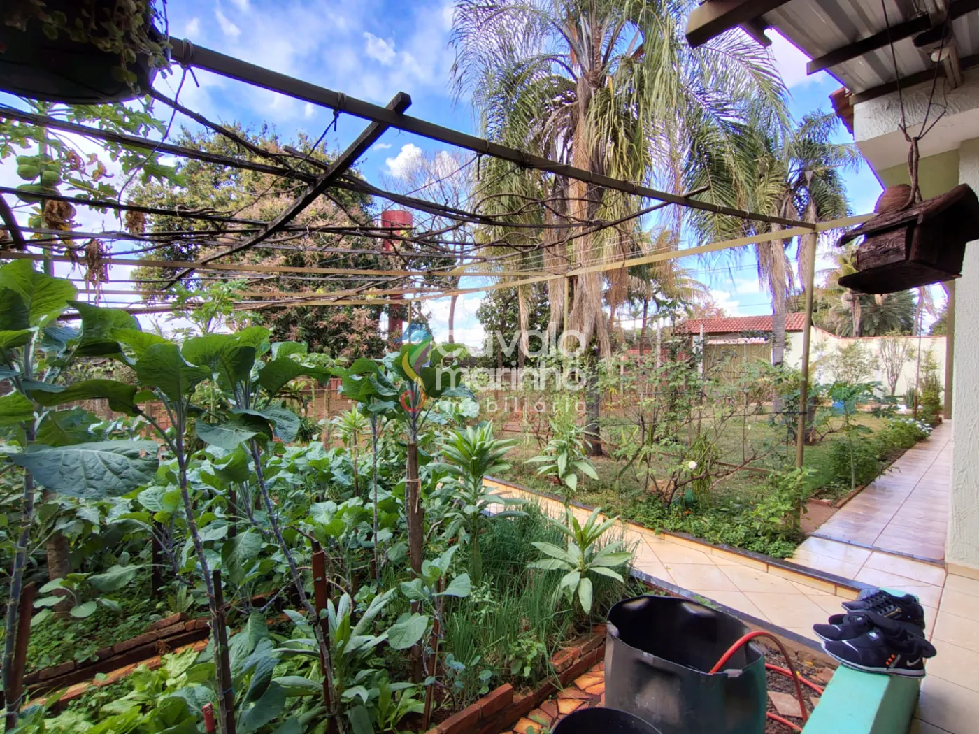 A área externa é um convite ao lazer e contato com a natureza, com amplo quintal, churrasqueira, lago, horta e 6 vagas cobertas na garagem.